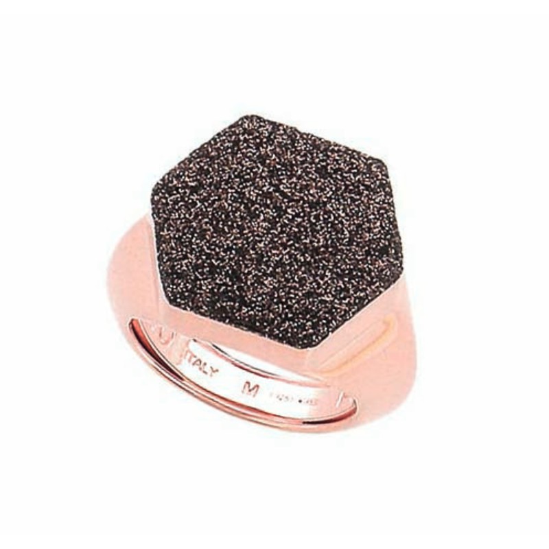Anello esagono della collezione POLVERE DI SOGNI in argento con finitura in oro rosa lucido e polvere di diamanti color bronzo.