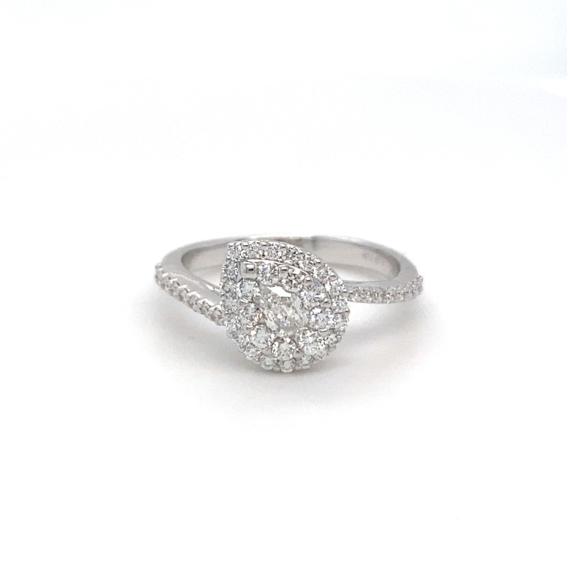 Anello in oro bianco con diamante centrale taglio goccia e doppio contorno di diamanti taglio brillante. Il pavé continua anche sul gambo asimmentrico.