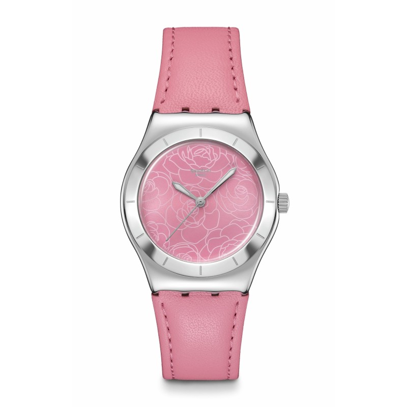 L'orologio ha una cassa in acciaio inossidabile lucidato e una lunetta abbinata con indici incisi. Completano il look un cinturino in pelle rosa con cuciture rosa con passante in pelle rosa e una fibbia in acciaio inossidabile lucido.