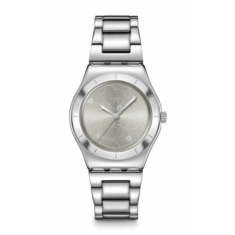 Questo elegante orologio in acciaio inossidabile presenta un quadrante grigio spazzolato soleil con un motivo floreale bianco stampato, lancette delle ore e dei minuti color argento che si illuminano al buio e una lancetta dei secondi color argento.