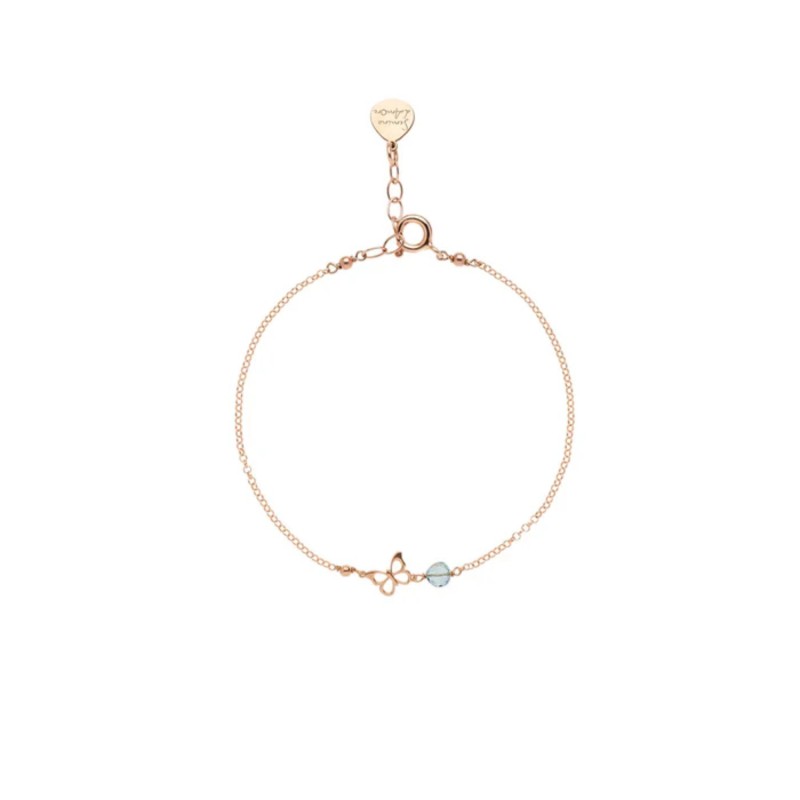 Bracciale in argento placcato oro rosa con charm a forma di farfalla e semino in topazio azzurro sfaccettato.
