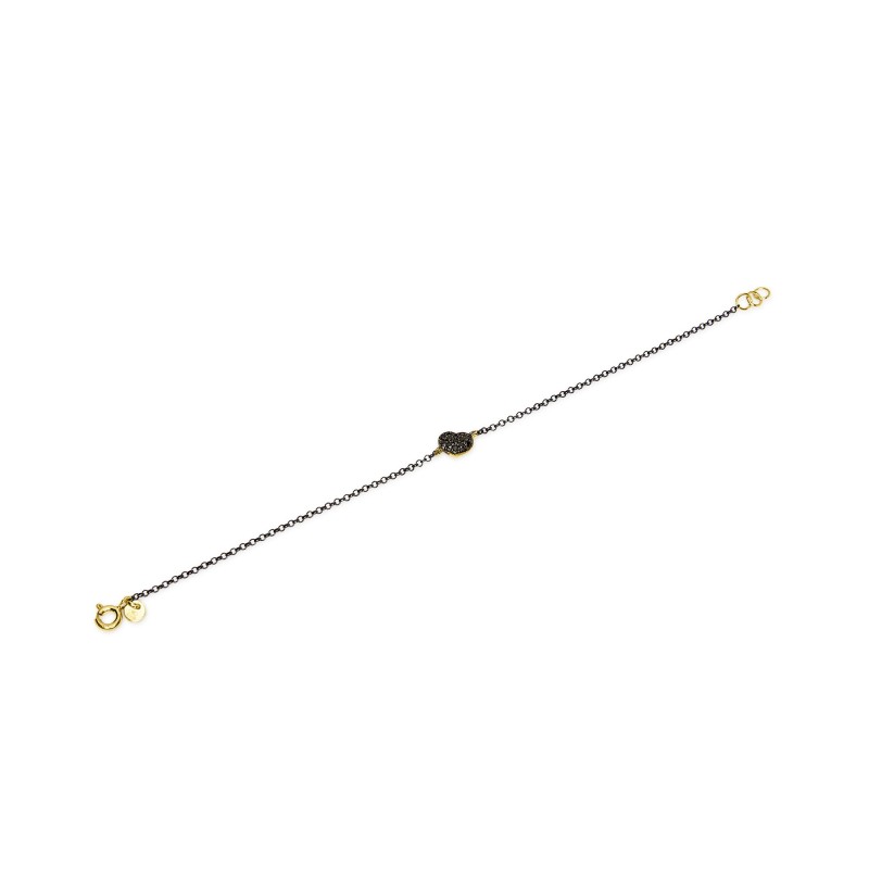 Bracciale con cuore bombato in oro giallo 9 kt e pavè di diamanti neri. La catena in oro sabbiata è rifinita con una galvanica ad alta resistenza nera.