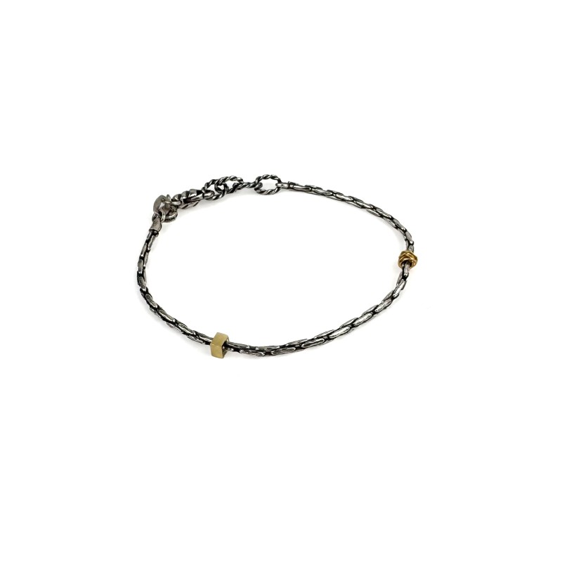 Bracciale in argento a catena forzatina con nodo in oro 18kt e cubetto in oro 18kt con due diamanti neri naturali.