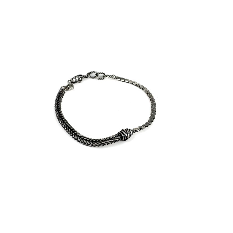 Bracciale in argento brunito composto da uno spezzone di maglia spiga piatta e mezza groumette piatta, con nodo in argento nel mezzo.