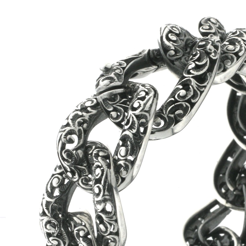 Bracciale intarsiato a mano con l'antica tecnica del bulino a maglia groumette grande. La particolare lavorazione traforata rende questo gioiello di grande impatto visivo e molto leggero.