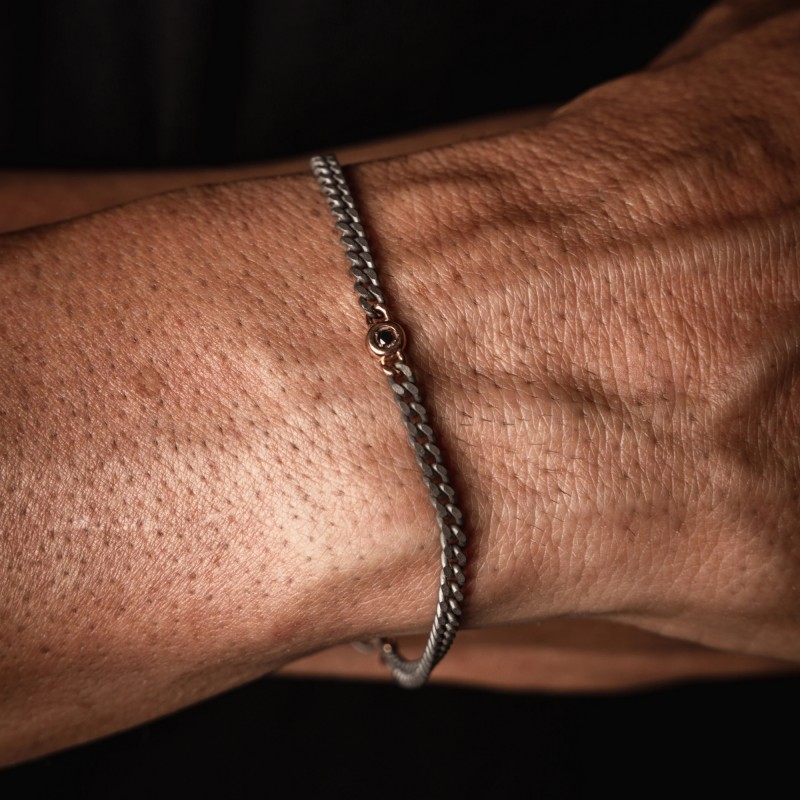 Bracciale uomo in titanio, diamanti black sul punto luce e chiusura in oro rosso 9 kt. Un punto luce in oro rosso 9kt, sulla quale sono incastonati 2 diamanti black da 3 punti per una caratura totale di 6 punti, è l'elemento principale del bracciale. Al punto luce, si collega un'elegante catena groumette che termina con una preziosa chiusura a gancio in oro rosso 9 kt. Alla chiusura in oro rosso si trova l'affascinante charms pendente rosso. Un comodo e prezioso bracciale che per leggerezza e manifattura, permette massimo comfort e adattabilità ad ogni polso.