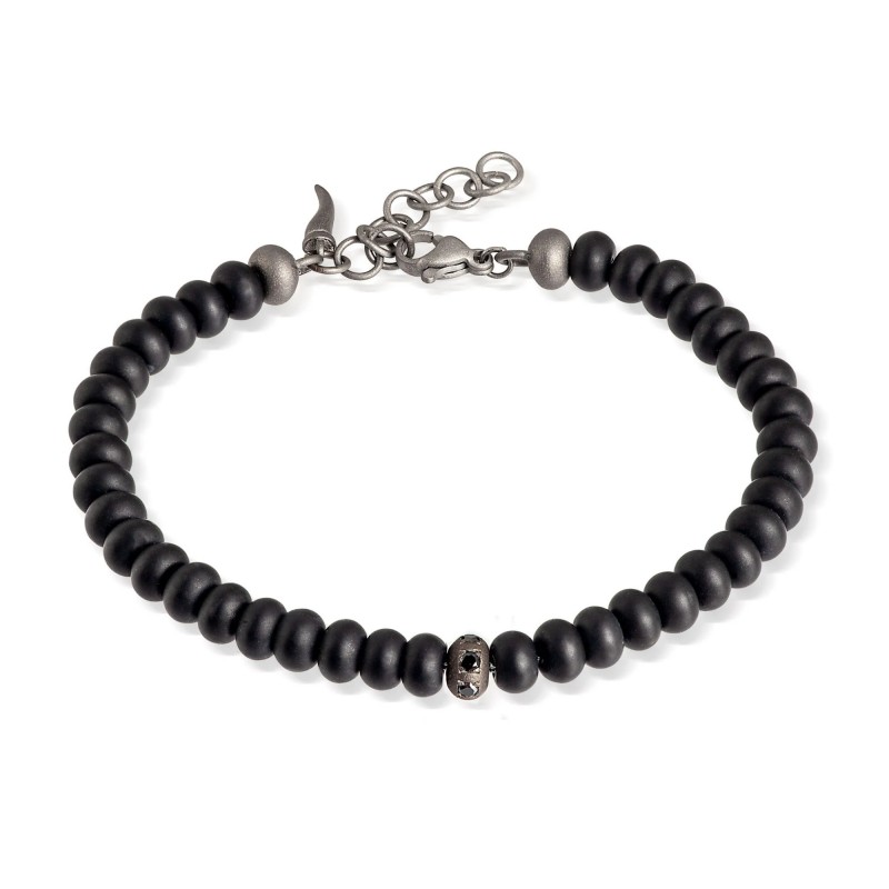 Bracciale in titanio, sfere in onici opache, diamanti black da 3 punti e affascinante charms in titanio.
