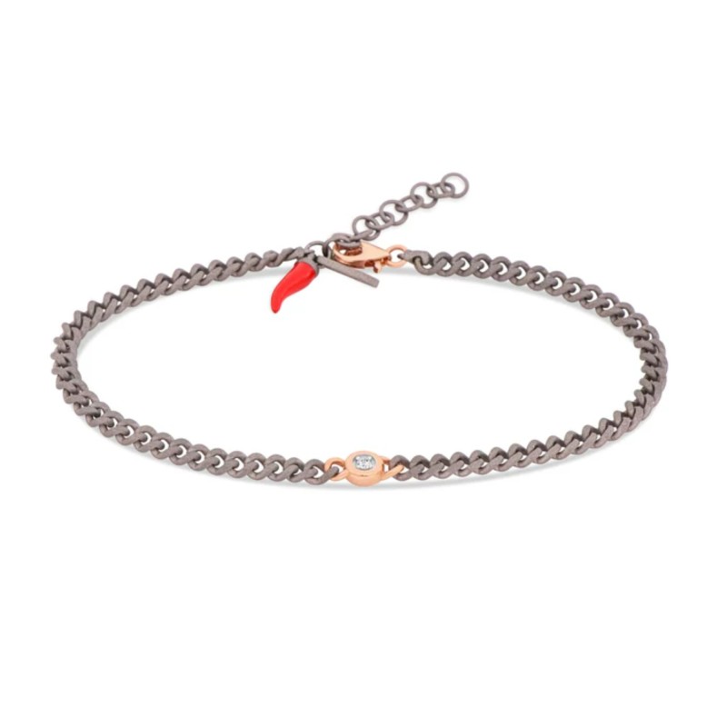 Bracciale uomo in titanio, diamanti bianchi sul punto luce e chiusura in oro rosso 9 kt. Un punto luce in oro rosso 9kt, sulla quale sono incastonati 2 diamanti bianchi da 3 punti per una caratura totale di 6 punti, è l'elemento principale del bracciale. Al punto luce, si collega un'elegante catena groumette che termina con una preziosa chiusura a gancio in oro rosso 9 kt. Alla chiusura in oro rosso si trova l'affascinante charms pendente rosso. Un comodo e prezioso bracciale che per leggerezza e manifattura, permette massimo comfort e adattabilità ad ogni polso.