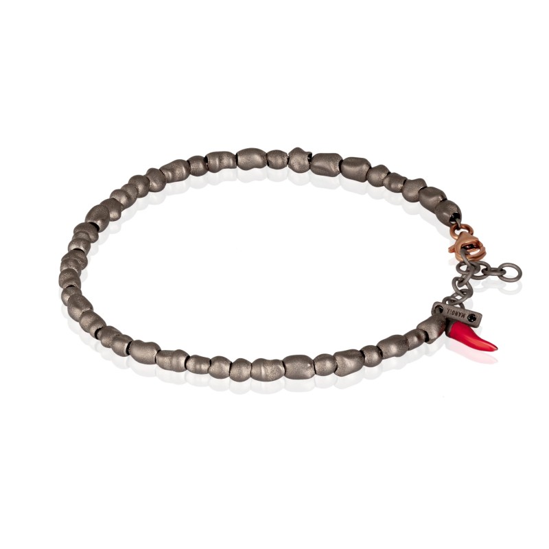 Una fila di sassi in titanio scorrono attraverso una robusta catena interna dello stesso materiale, terminando con una preziosa chiusura con moschettone in oro rosso ed un piccolo cornetto pendente.