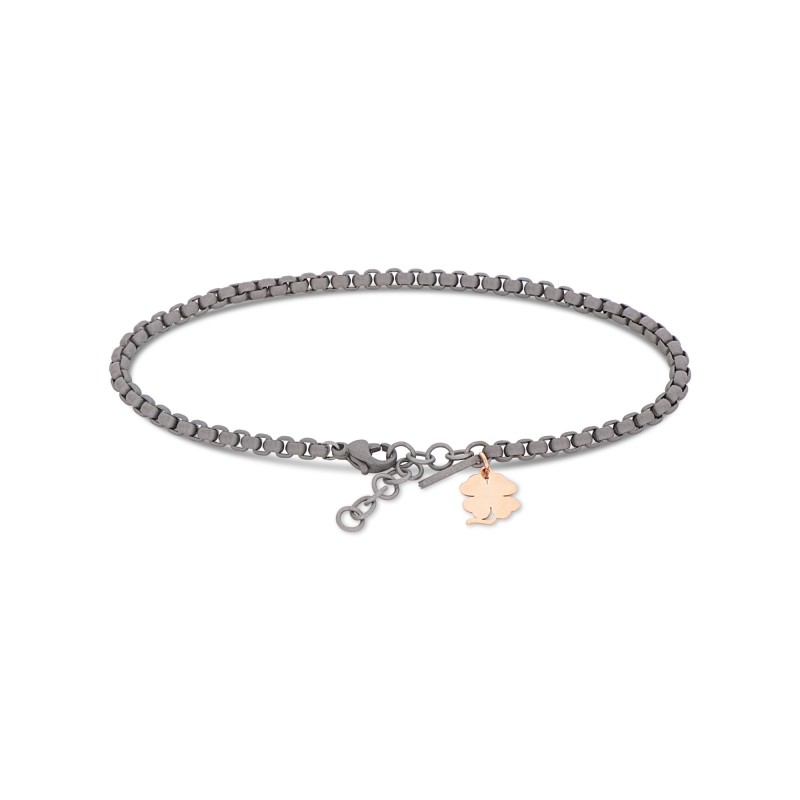 Bracciale uomo in titanio con charme in lastra in oro rosso 9 kt a forma di quadrifoglio.