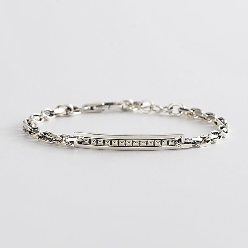 Bracciale a maglia forzatina in argento brunito con piastra con borchie.