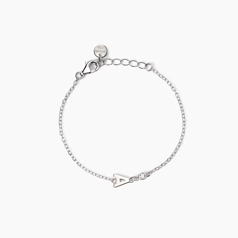 I bracciali da neonato “Welcome Baby” sono leggere catene d’argento con un motivo centrale a forma di lettera, la sua iniziale, impreziositi da un diamante Lab-Grown.