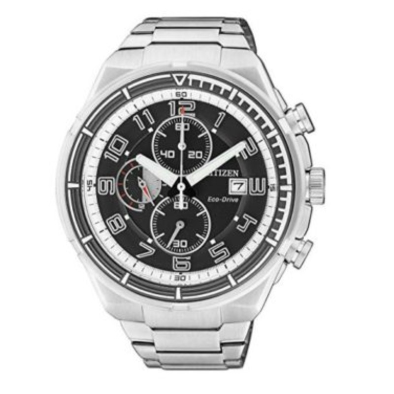 Orologio da polso Citizen per uomo sportivo collezione CRONO 0490 Eco Drive. Cassa in acciaio diametro 44mm con fondello serrato a vite. Quadrante nero con numeri arabi e vetro minerale. Bracciale in acciaio con chiusura deployante in acciaio. Movimento Eco Drive a carica di luce infinita con riserva di carica di 210 giorni. Resistente all'acqua (water resistant) 10 atm (100m), funzione di cronografo a 1/5 di secondo e visualizzazione delle 24 ore.