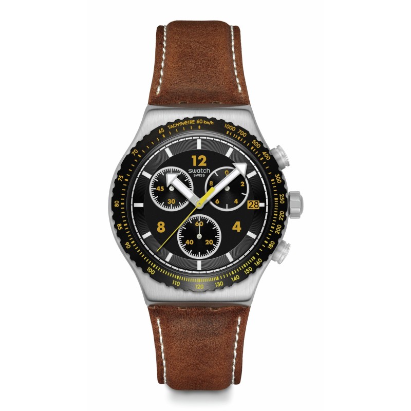 Questo cronografo in acciaio inossidabile presenta un quadrante nero spazzolato soleil con numeri stampati in giallo, indici che si illuminano al buio e datario giallo con stampa nera a ore 3. Lancette di ore e minuti argentate a forma di freccia che si illumina al buio e una lancetta gialla dei secondi cronografici indicano l'ora. Ha una cassa in acciaio inossidabile spazzolato e una lunetta con rivestimento in PVD nero e scala tachimetrica stampata in giallo. Completano l’orologio il cinturino in pelle marrone con cuciture a contrasto, i passanti in pelle marrone e la mezza fibbia in acciaio inossidabile spazzolato.