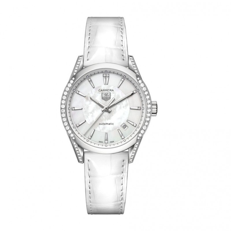 TAG HEUER CARRERA WV2212.FC6264 Automatico 36 mm Cassa in acciaio con diamanti Quadrante bianco perlato Cinturino in coccodrillo bianco Chiusura deployante