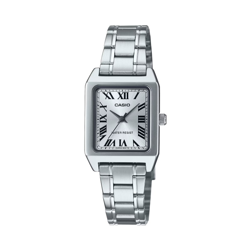 Una versione moderna con design quadrato del classico orologio analogico. L'elegante colore del quadrante e gli indici con numeri romani sono perfetti per donare quel tocco elegante e raffinato.