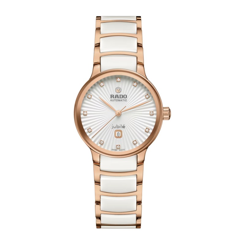 Il classico Centrix Automatic Diamonds è stato rielaborato non solo tecnicamente, ma anche esteticamente. Il nuovo modello dispone di un cristallo zaffiro arrotondato che si estende fino al bordo e di una cassa ricurva che si integra con l’estremità del cristallo. Le anse della cassa ridisegnate e il bracciale in acciaio lucido rivestito in PVD color oro rosa con maglie centrali in ceramica hi-tech bianca completano l’estetica rinnovata di questo iconico segnatempo. Il quadrante sfaccettato color argento dispone di uno spettacolare effetto 3D realizzato tramite la stampa di un quadrante sagomato che viene poi riempito di lacca. All’interno, il calibro R582 a tre lancette supera gli standard di precisione nei test da 3 a 5 posizioni e grazie alla spirale antimagnetica Nivachron™ garantisce elevata affidabilità e puntualità. L’orologio è impermeabile fino a 50 m e offre una riserva di carica di 48 ore.