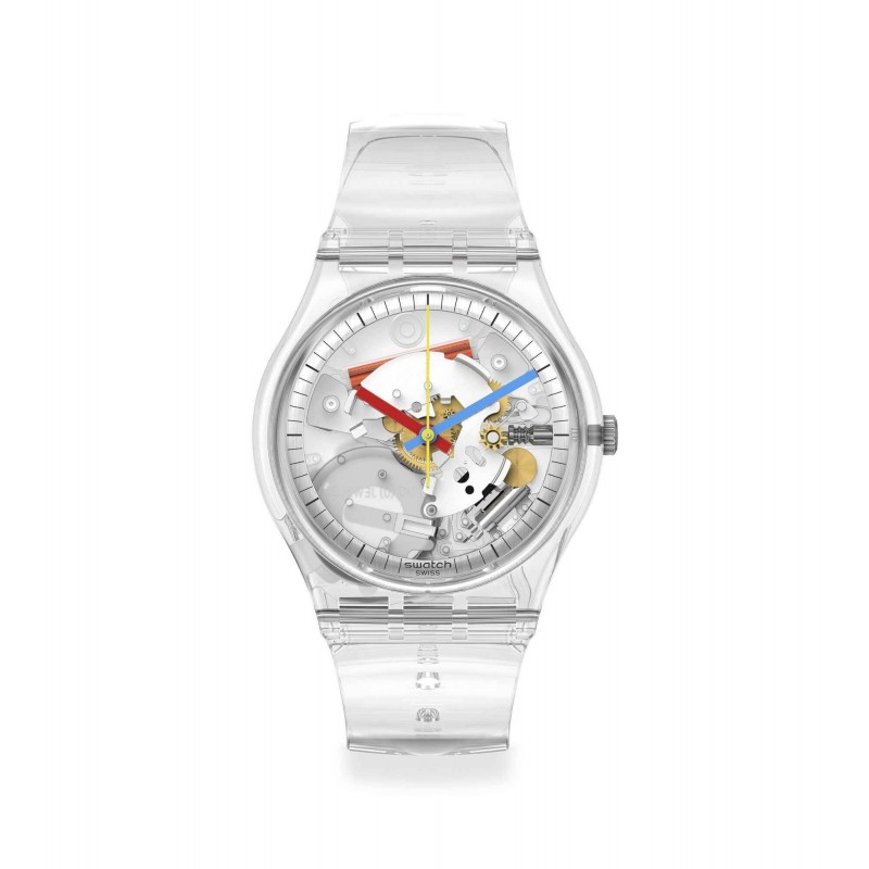 Puro e classico, questo orologio trasparente è caratterizzato da una cassa chiara brillante in plastica di origine biologica e una un cinturino chiaro in TPU. L'essenza del tempo si palesa in modo chiaro: un anello argentato risplende sul quadrante, con lancette rosse, blu e gialle e indici neri.