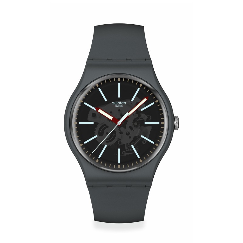 Il quadrante grigio scuro trasparente di questo segnatempo lascia intravedere il movimento e presenta indici azzurri e minuteria beige. Le lancette delle ore e dei minuti bordeaux che si illuminano al buio e la lancetta dei secondi azzurra indicano l'ora dietro il vetro biosourced. Una cassa biosourced grigio scuro con cinturino, passante e fibbia biosourced abbinati completano l'orologio.