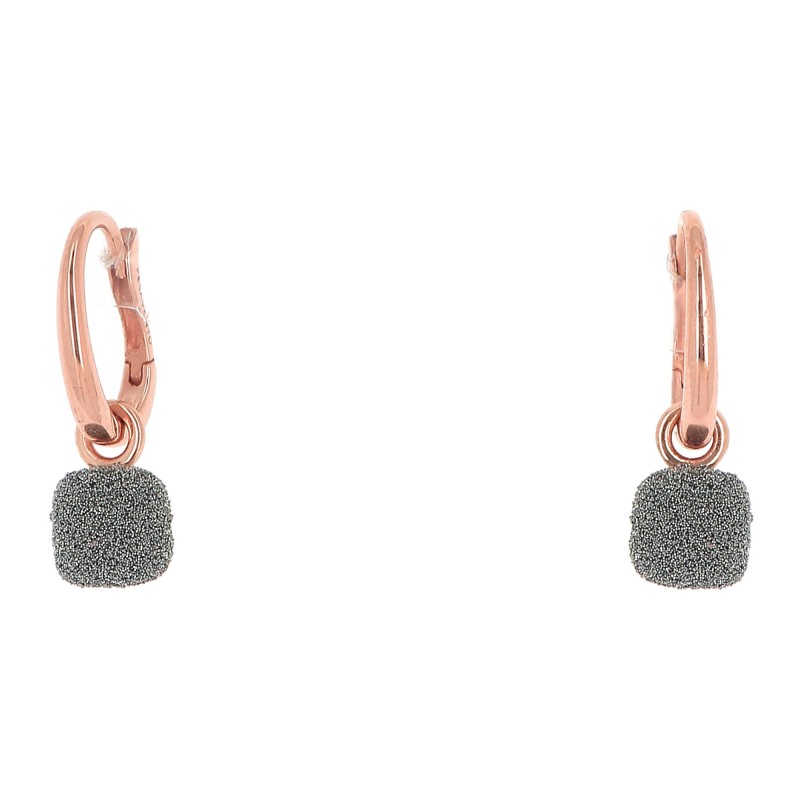 Orecchini in oro rosa 18 kt a scattino con pendente a forma di cubetto con finitura polvere di diamanti grigia.