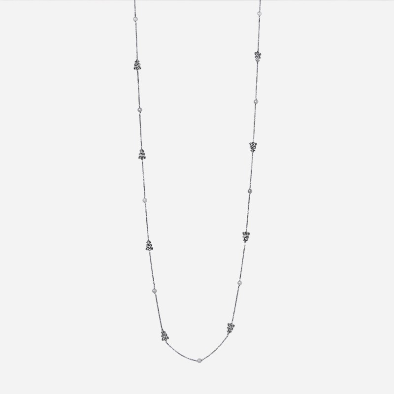 Collana composta da catena groumette lunga in argento brunito inciso a mano con l’antica tecnica del bulino ed elementi a giglio traforato alternati a perle bianche.