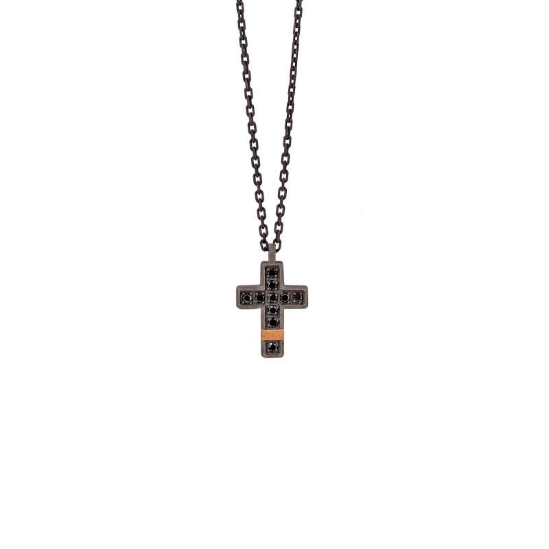 Collana uomo in titanio, diamanti black e oro rosso 18 kt, oro rosso 9 kt e catena. Accanto al titanio, in questa croce si trova come elemento di preziosita', un riporto in oro rosso 18 kt. 10 diamanti black, pari ad una caratura di 10 punti, rivestono l'intera superficie del ciondolo, lasciando in evidenza l'inserto in oro rosso 18 kt.