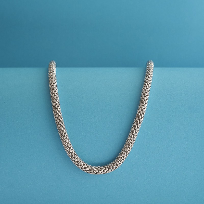 La maglia Novecento rappresenta la sintesi dell'arte orafa della maison, e trova esemplare applicazione nella realizzazione di questo girocollo in oro bianco 18kt, amplificandone semplicità ed eleganza.
