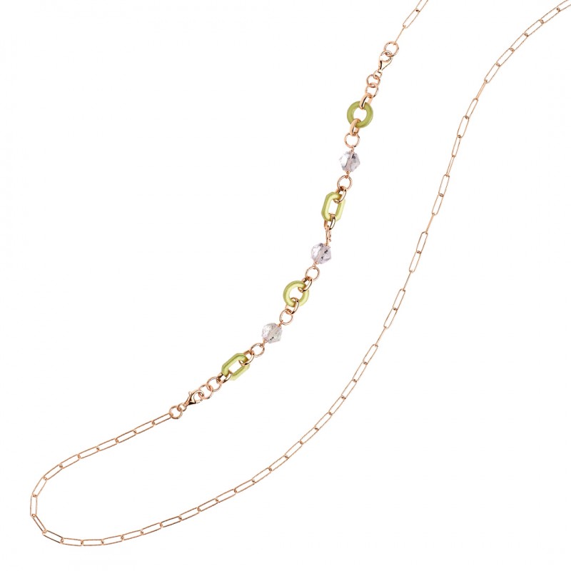 Bracciale-collana realizzato a mano in Italia in Italia in argento 925 placcato oro rosa 24 kt, legno d’ulivo di recupero e pietre semi preziose.