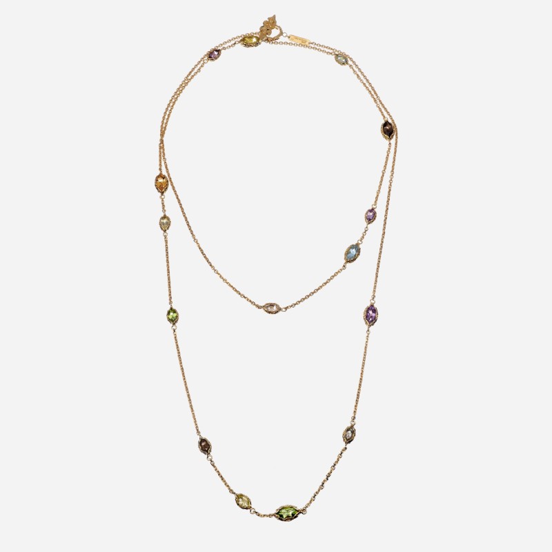La Collana Shri in argento dorato è unica per la sua lunghezza in cui si alternano pietre naturali miste in taglio navetta di diverse dimensioni*. Un accessorio perfetto per dare luce agli outfit di tutti i giorni.