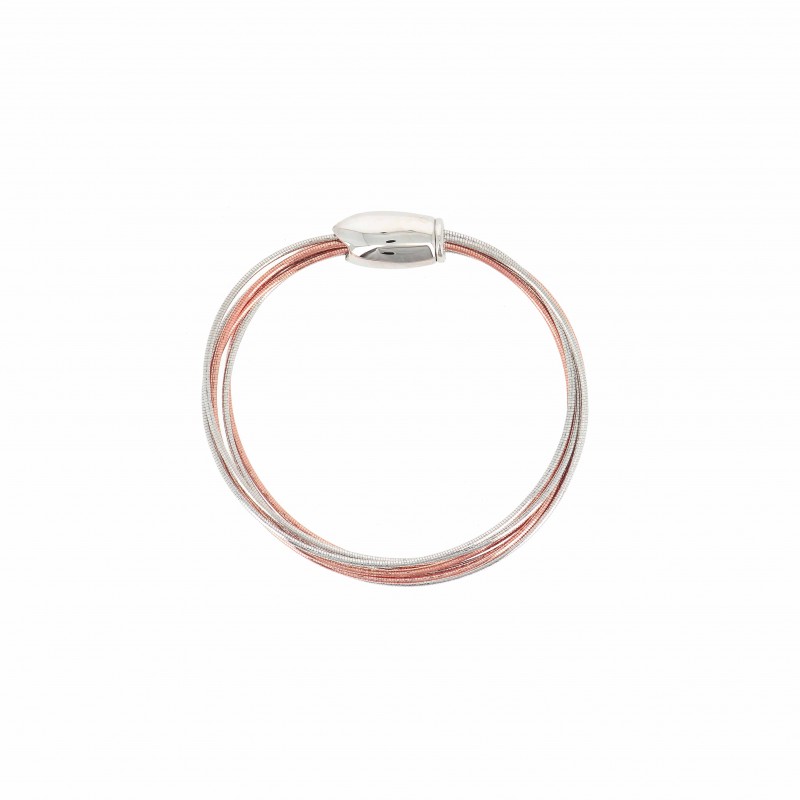 Bracciale della linea DNA SPRING in argento composto da 5 fili, tre dei quali con finitura rodio e due con finitura oro rosé. Chiusura magnetica.