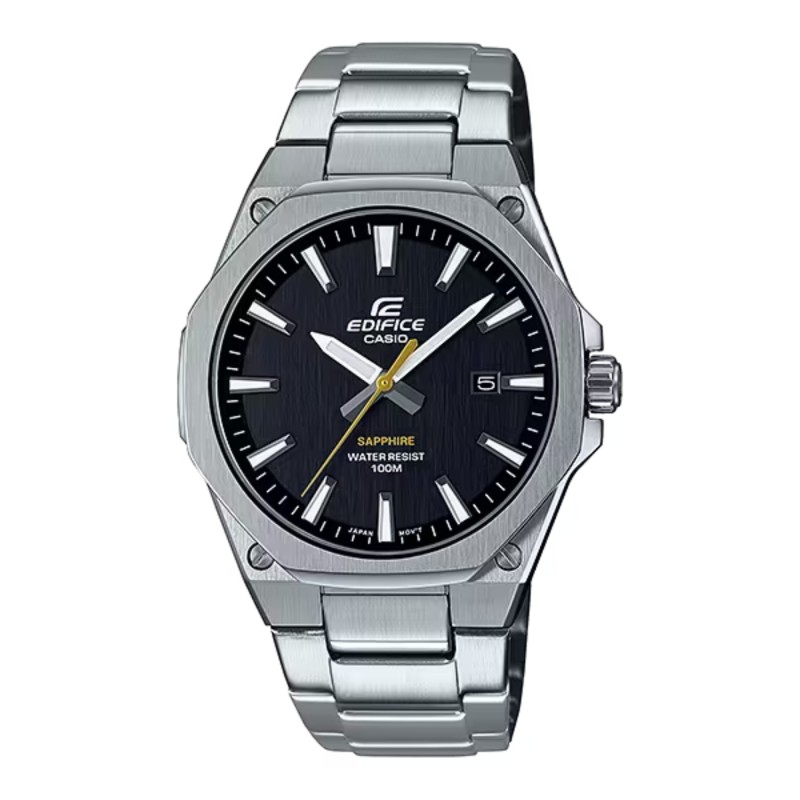 Serie EDIFICE SLIM con vetro zaffiro | questo modello analogico a tre lancette presenta una cassa sottile da 7,8 mm di spessore che migliora la vestibilità. L'orologio vanta una lunetta ottagonale piatta con finitura a filo che dona all'orologio un aspetto sportivo e lussuoso al tempo stesso. Anche il quadrante con la finitura a filo regala la sensazione di avere di fronte un prodotto di alta qualità. Le viti ai quattro angoli della cassa, l'importante design degli indici e la lancetta dorata dei secondi creano la finitura sportiva. Con vetro zaffiro antigraffio.