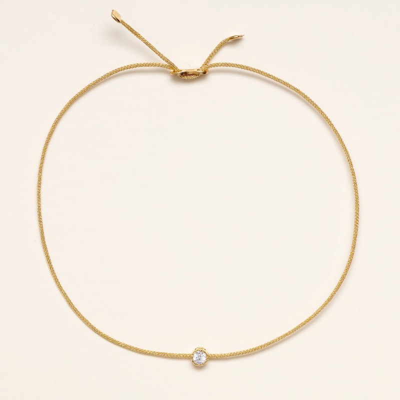 Bracciale regolabile dal design essenziale con filo in tessuto e punto luce centrale che cattura delicatamente la luce. Minimal e raffinato, è pensato per essere indossato ogni giorno, da solo per un look discreto oppure abbinato ad altri gioielli per uno stile contemporaneo e sofisticato. Un dettaglio luminoso che impreziosisce il polso con eleganza.
