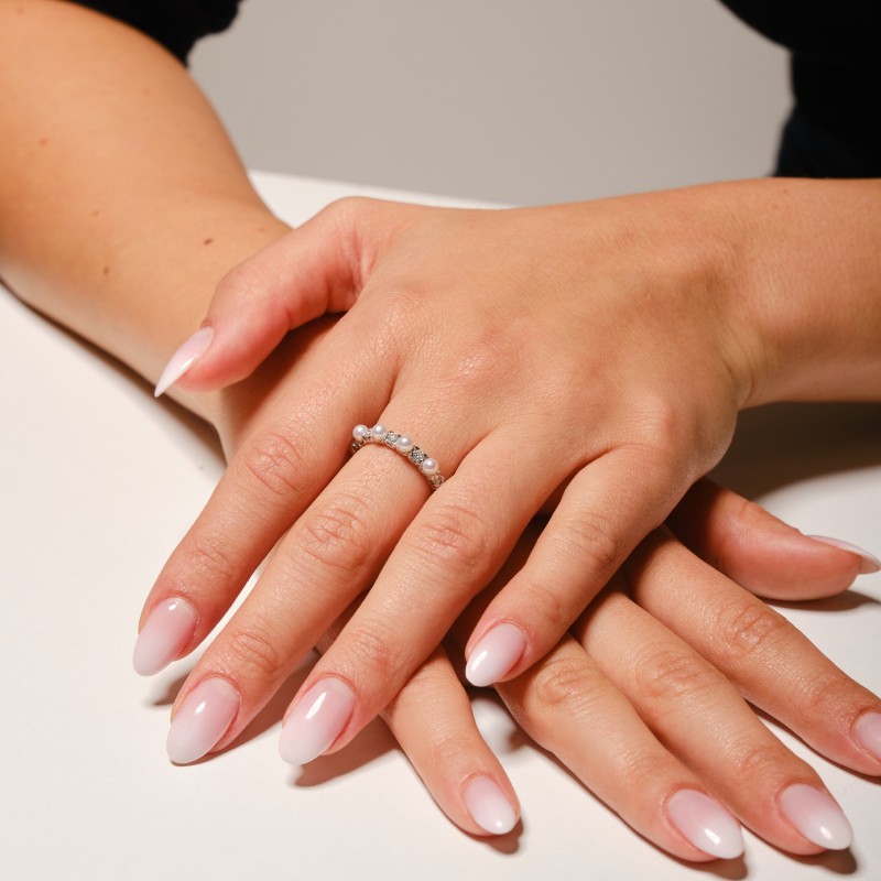 Anello in oro bianco 18kt con perle akoya naturali 3mm alternate a diamanti naturali taglio brillante.