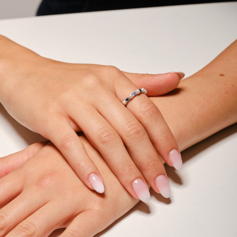 Anello in oro bianco 18kt con perle akoya naturali 3mm alternate a zaffiri ceylon blu di varie intensità.