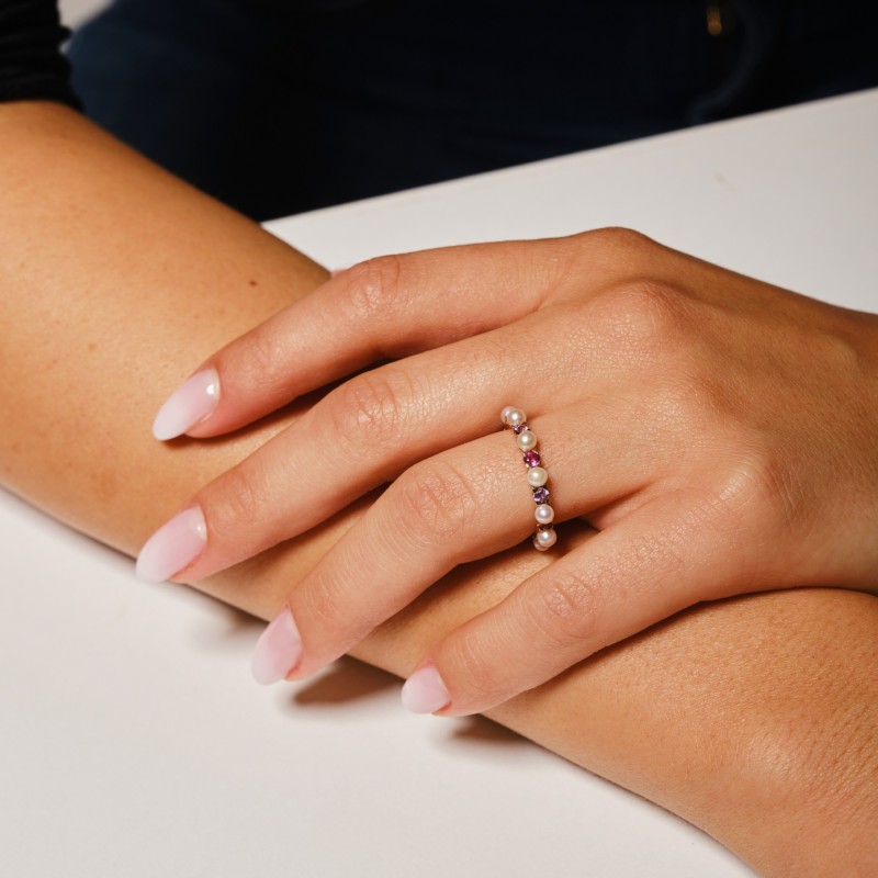 Anello in oro rosa 18kt con perle akoya naturali 3mm alternate a zaffiri rosa di varie intensità.