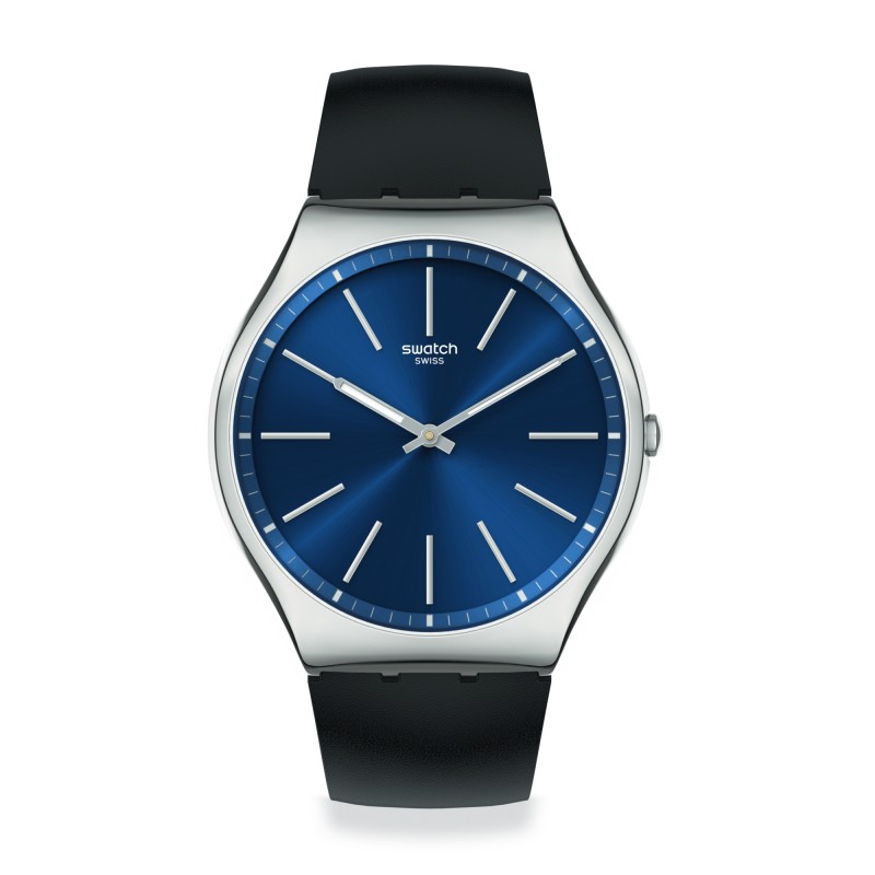 Quest’orologio in acciaio inossidabile ultraleggero è un oggetto senza tempo. La cassa lucidata di questo orologio mette in risalto il quadrante blu spazzolato soleil con inserti Swatch argentati. Il cinturino in pelle nera ha una fibbia in acciaio inossidabile.