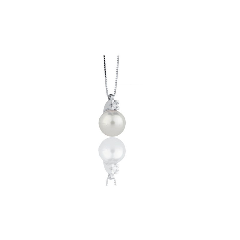 Pendente con catena in oro 18kt bianco, perla giapponese e diamanti.