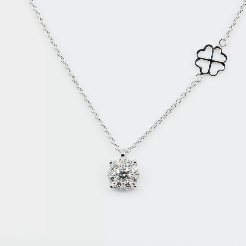 Collana girocollo in oro bianco 18 kt con castone pendente in oro e diamanti, composto da una pietra centrale di ct 0.11 e un contorno di diamanti più piccoli.