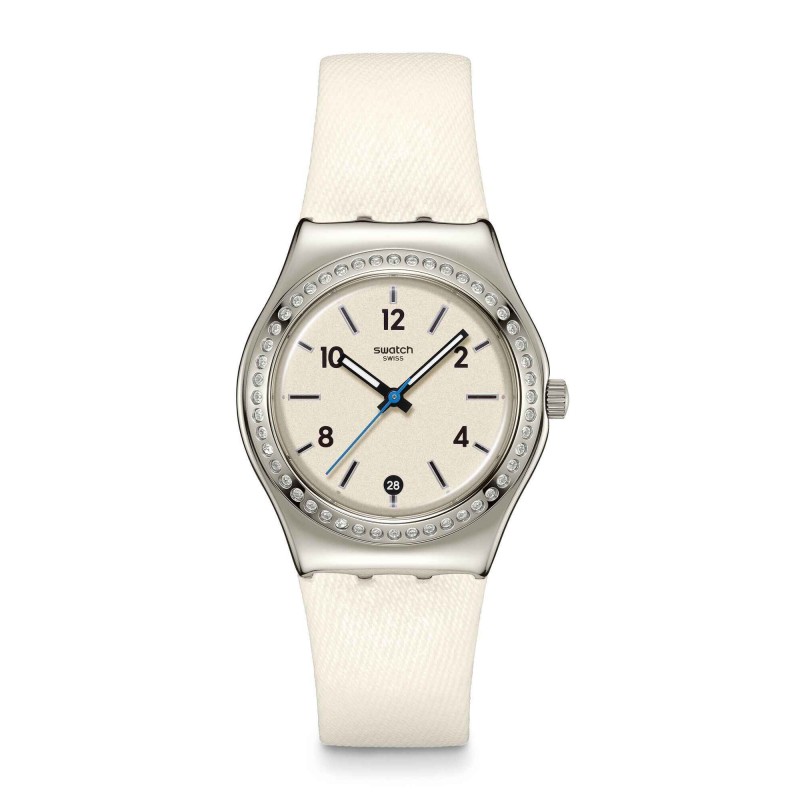 Questo orologio presenta un quadrante color avorio con numeri stampati in nero, lancette delle ore argentate e stampate in nero e datario a ore 6. L’orario è indicato dalle lancette delle ore e dei minuti nere che si illuminano al buio e dalla lancetta dei secondi blu. La cassa in acciaio inossidabile lucido è abbinata a una lunetta coordinata con cristalli. Completano il look il cinturino e il passante in pelle bianca con fibbia in acciaio inossidabile lucido.