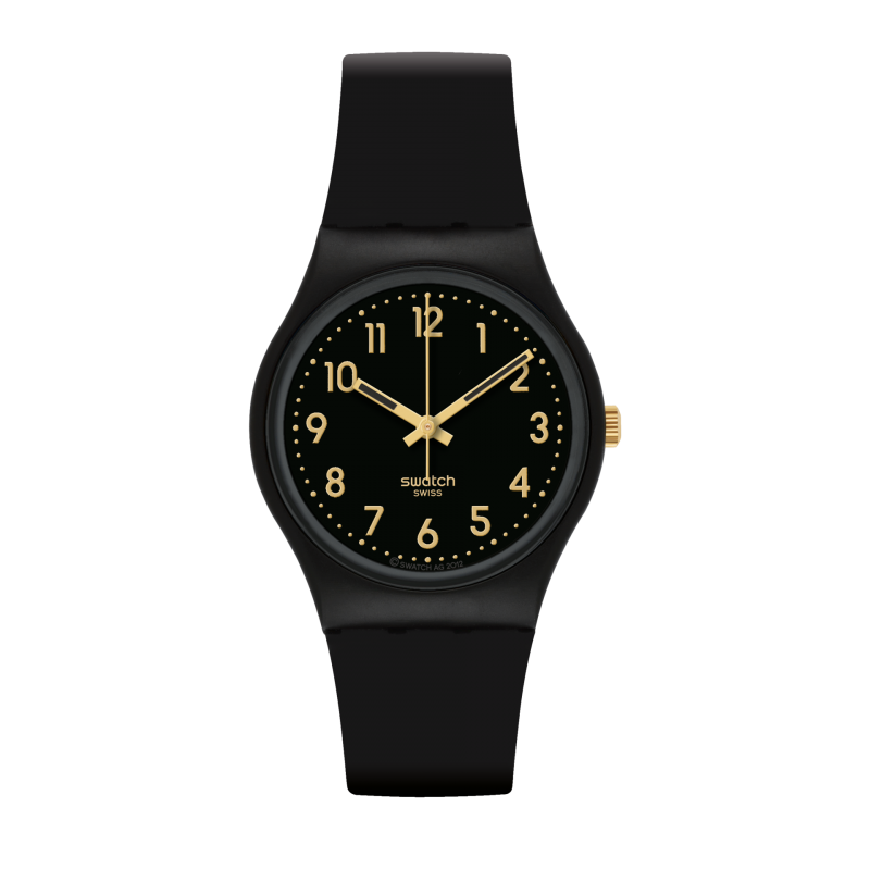 Un luccichio dorato distingue questo Swatch con il cinturino e la cassa neri, entrambi realizzati con materiale biosourced. I numeri sul quadrante nero rendono ogni momento d'oro.