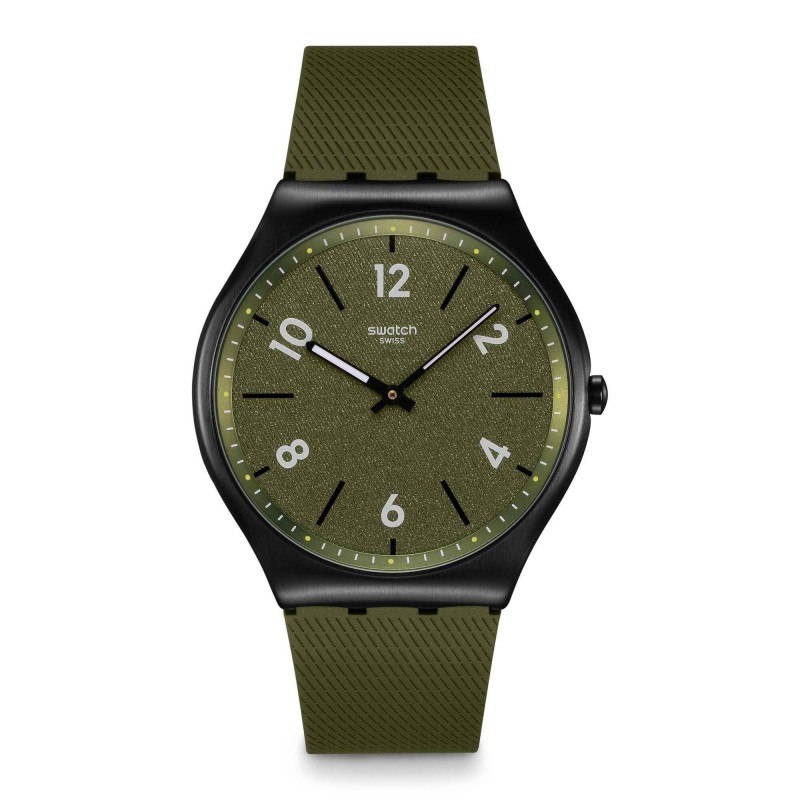 Questo orologio ultrasottile presenta un quadrante verde scuro con numeri stampati in bianco, lancette delle ore stampate in nero, rialzo verde scuro con tacche dei minuti stampate in bianco e verde, lancette delle ore e dei minuti nere che si illuminano al buio. La cassa in acciaio inossidabile spazzolato con PVD nero è abbinata a una fibbia coordinata e a un cinturino testurizzato verde scuro opaco con passante verde scuro opaco.
