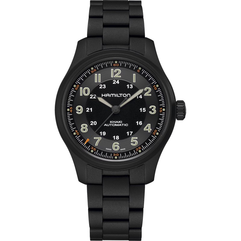 Caratterizzato da una cassa in titanio e bracciale con rivestimento in PVD nero, il Khaki Field Titanium 42 mm è un orologio altamente versatile, perfetto per essere indossato in ogni occasione. Il quadrante nero dall’ottima leggibilità ti permette di tenere i tempi di tutte le tue avventure, mentre il bracciale presenta una finitura sabbiata che aggiunge robustezza e carattere al design militare. Abbinando leggerezza e funzionalità allo stile militare, il Khaki Field Titanium è il tuo fedele alleato nella ricerca di nuove esperienze.