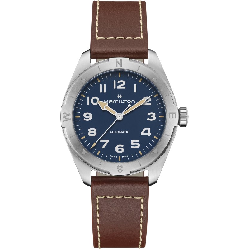 Preparati per un’avventura all’aria aperta con il Khaki Field Expedition, un orologio ideale per tutte le attività outdoor con un design a bussola, che ti permetterà, durante le escursioni, di orientarti con l'aiuto del sole. Racchiuso in una cassa in acciaio da 41 mm corredata da un cinturino in pelle marrone, questo orologio è dotato di corona a vite per proteggere il movimento in qualunque condizione atmosferica. Dotato di un quadrante blu testurizzato con rivestimento in Super-LumiNova® per una leggibilità eccezionale, il Khaki Field Expedition possiede tutta la robustezza di cui hai bisogno.