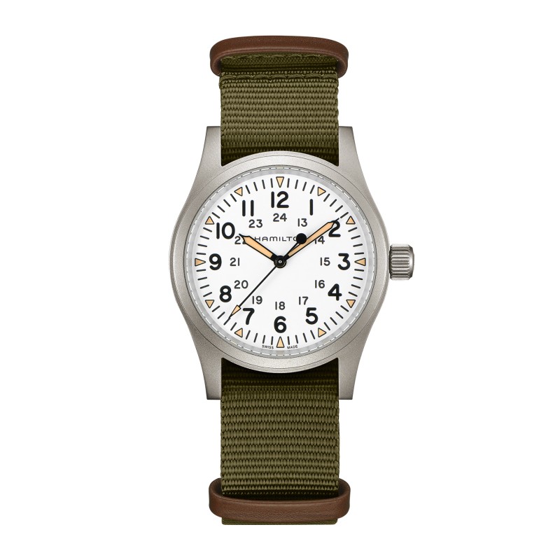 Cassa in acciaio opaco da 38 mm, tre lancette, quadrante bianco, indici triangolari con Super-LumiNova® di colore simile ai precedenti in radio, robusto cinturino NATO: il nuovo Khaki Field Mechanical è una riproduzione fedele del suo predecessore degli anni Sessanta e si inserisce alla perfezione nella tradizione militare di Hamilton. Costruito per durare, è l'orologio militare per eccellenza.