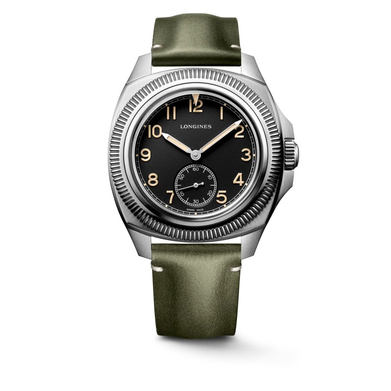 Animata da un esclusivo calibro meccanico a carica automatica di Manifattura Longines, questa versione è dotata di cinturino in pelle marrone con cuciture beige. L'orologio è contenuto in uno speciale cofanetto insieme a un cinturino NATO verde kaki realizzato in materiali riciclati.