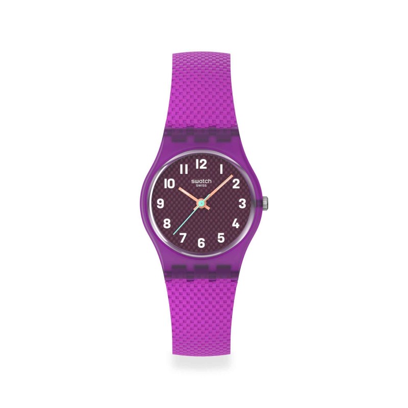Questo orologio presenta un quadrante testurizzato marrone con numeri stampati bianchi, lancette delle ore e dei minuti arancione chiaro che si illuminano al buio e una lancetta dei secondi verde chiaro in una cassa trasparente e opaca viola. Il cinturino testurizzato viola opaco è completato da un passante viola opaco e da una fibbia viola trasparente e opaca.