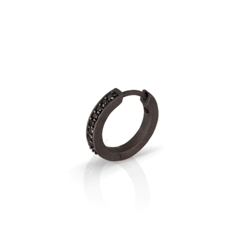 Orecchino uomo in titanio e diamanti black. Il cerchietto in titanio è il protagonista di questo orecchino. Sulla sua superficie anteriore sono incastonati 9 diamanti black per una caratura totale di 9 punti. All'interno si trova il diamante black da 1 punto simbolo del marchio MANO.