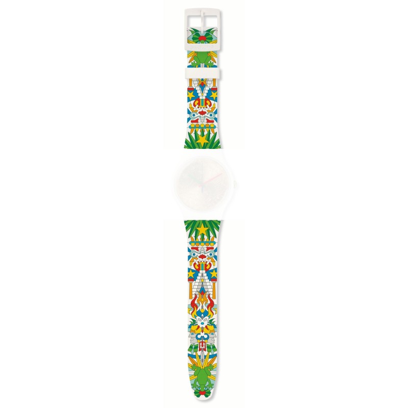 Cinturino in silicone bianco con stampa multicolore fronte e retro e fibbia in plastica bianca per modello Swatch New Gent.