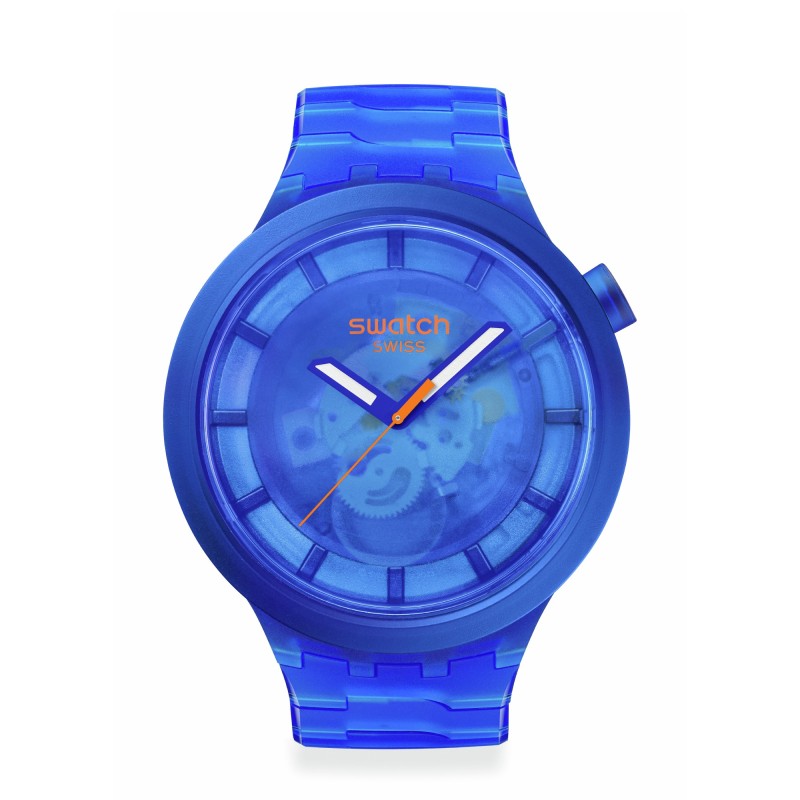 Questo orologio blu oversize sfoggia un look completamente trasparente, dalla cassa, al quadrante e alla lunetta biosourced fino al bracciale biosourced con fibbia a farfalla. Il quadrante blu trasparente biosourced offre una visione del movimento, mentre le lancette delle ore e dei minuti blu fosforescenti e la lancetta dei secondi arancione a contrasto indicano l'ora sotto il vetro biosourced.
