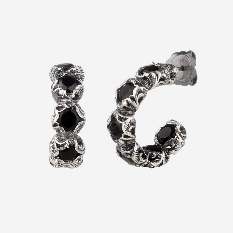 L'iconico orecchino a cerchio impreziosito da 6 pietre naturali taglio rotondo in spinelli neri.